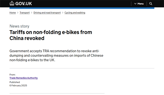 英國貿(mào)易救濟(jì)局取消懲罰性關(guān)稅原文鏈接:https://www.gov.uk/government/news/tariffs-on-non-folding-e-bikes-from-china-revoked